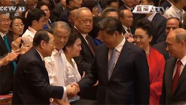 《勝利與和平》文藝晚會(huì)現(xiàn)場(chǎng),習(xí)近平主席和謝國民董事長親切握手