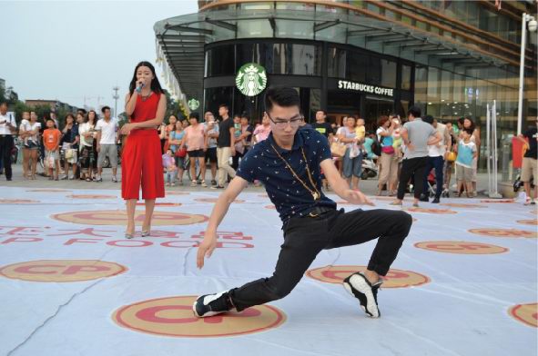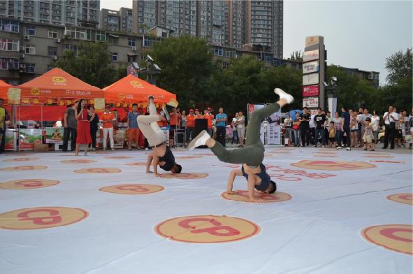 活動(dòng)時(shí)長(zhǎng)大約30分鐘,首先快閃人員在王府井南昌路店門口廣場(chǎng)中央集合,穿戴著簡(jiǎn)單大方、整齊利索的衣物四處游走在人群中。時(shí)間一到,音樂響起,歌手慢慢走近中央,一首振奮人心的“我和你”拉開整個(gè)活動(dòng)的序幕,瞬間引起了在場(chǎng)所有人群的關(guān)注。緊接著舞蹈演員閃亮上場(chǎng),展開了一場(chǎng)激情澎湃的機(jī)械舞,帶動(dòng)現(xiàn)場(chǎng)觀眾情不自禁參與到表演中來,此時(shí)人流迅速聚攏,引起圍觀。然后正大食品有限公司員工身著公司服裝,唱著正大集團(tuán)《愛是正大無私的奉獻(xiàn)》一起出現(xiàn)在廣場(chǎng)中央,隨后幾段歌舞串燒將現(xiàn)場(chǎng)氣氛推向***,在觀眾意猶未盡之時(shí)迅速閃開在人群之中?;顒?dòng)過程中穿插進(jìn)行了分發(fā)公司宣傳材料、食品安全知識(shí)宣傳單,現(xiàn)場(chǎng)觀眾品嘗了洛陽正大豬肉調(diào)理品、醬鹵產(chǎn)品及集團(tuán)現(xiàn)代食品。
